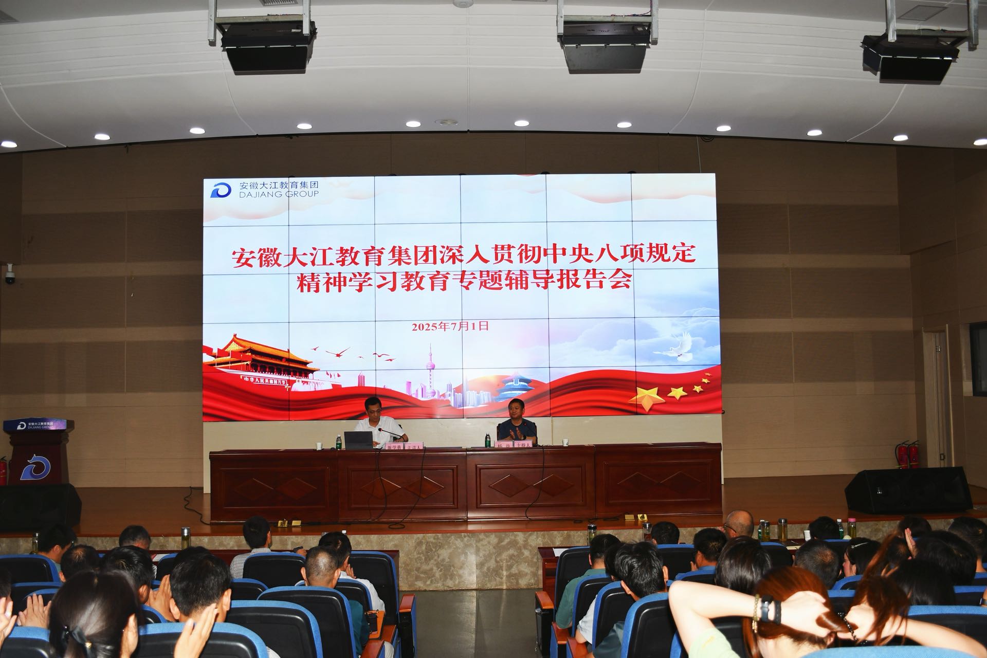筑牢思想根基 深化作风建设。为深入学习贯彻中央八项规定精神,持续强化党员干部纪律规矩意识,深化作风建设,7月1日下午,安徽大江教育集团在图文信息中心会议中心举办深入贯彻中央八项规定精神学习教育专题辅导讲座。集团党委书记、董事长杨益主持讲座,铜陵市纪委监委第二纪检监察室主任施学勇作专题报告。集团党委班子成员、中层副职及以上干部、各单位中层以上干部和全体党员,包括年轻干部、新提拔干部和关键岗位干部近300人参加了学习。