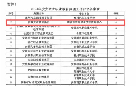 在此次综合评议中,由铜陵理工学校牵头组建的安徽大江教育集团表现卓越,再度荣获年度A等评价,这是集团继2022年获评A等后,在省职教集团评议中的再度获取此项荣誉。充分彰显了集团在全省职业教育领域的示范引领作用与综合实力。