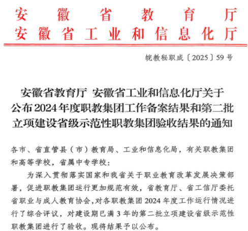 近日,安徽省教育厅与工信厅联合召开全省职教集团2024年度工作评议会,对建设期已满3年的第二批立项建设省级示范性职教集团进行了验收,同时对全省63家职教集团2024年度工作运行情况进行了综合评议。