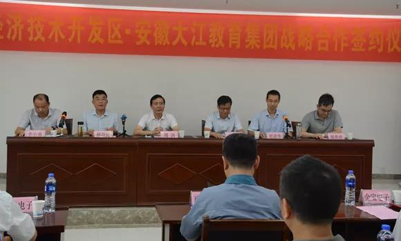 随后,杨益民和李小勇分别代表安徽大江教育集团和铜陵经开区在合作协议上签字,与会领导和各方代表见证签约。