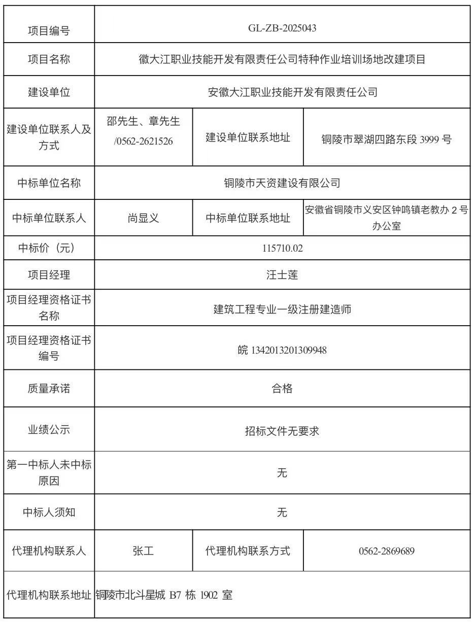 安徽大江职业技能开发有限责任公司特种作业培训场地改建项目中标结果公示